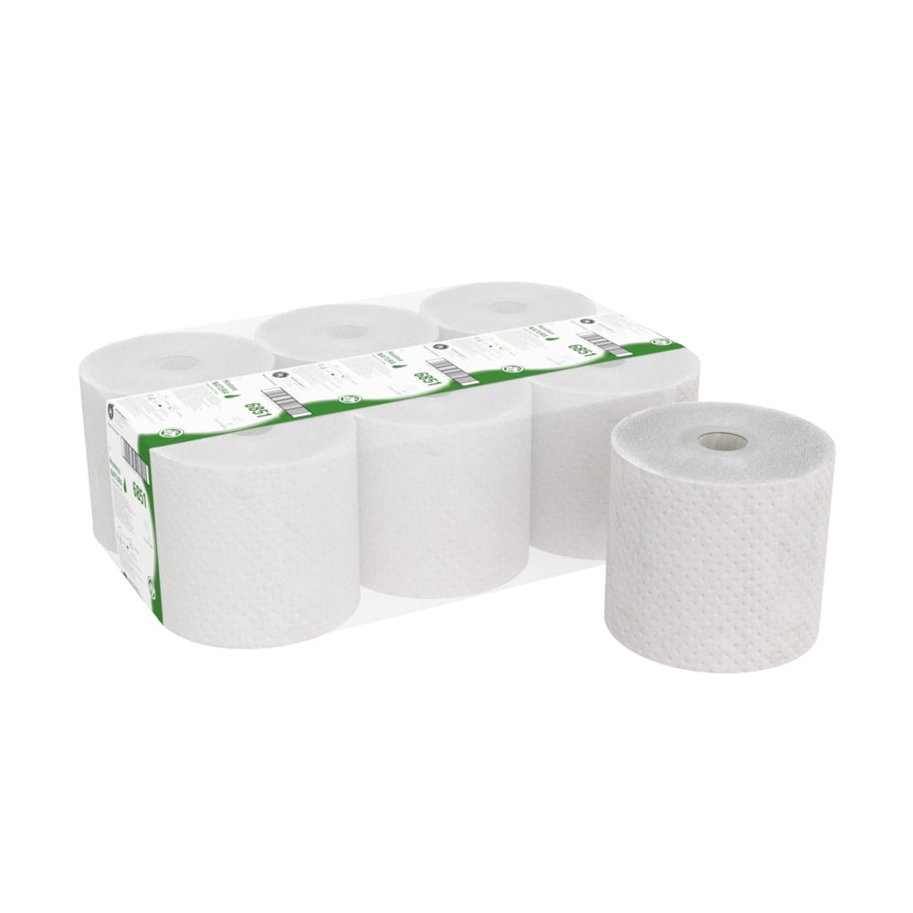 Hostess™ NATURA™ Toallas secamanos 100 % recicladas 6851 – Toallas secamanos en rollo de 2 capa – 6 rollos de toallas secamanos de 140m (840m en total)
