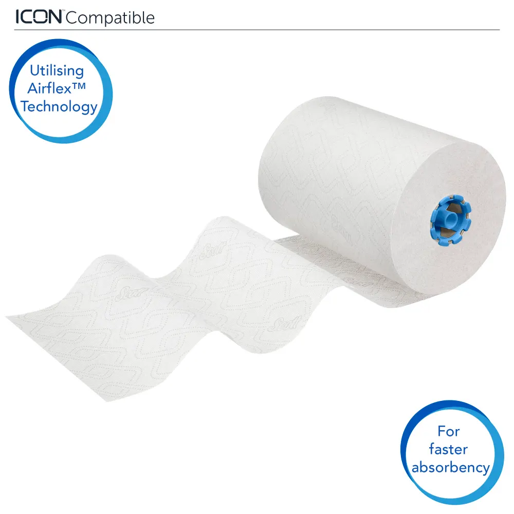 Mejora la experiencia en el aseo con las soluciones familiares y de confianza de Scott® Essential™, pensadas para ayudarte a cumplir las normas de higiene de aseos en entornos de alta frecuencia sin comprometer la calidad y el valor. Los rollos de toallas secamanos Scott® Essential™, los más fiables para el secado de manos diario, están diseñados para proporcionar una higiene de manos eficaz en aseos de mucho tránsito que requieren disponibilidad constante. Estas toallas de papel en rollo son las más largas del mundo, ofreciéndote mayor cantidad y menores exigencias de mantenimiento. Nuestra tecnología Airflex™ única en el mercado proporciona una absorción superior para un secado de manos más higiénico y eficaz que contribuye a la reducción de residuos. El rollo de toallas de papel Scott® Essential™ incorpora el sello en relieve de la marca Scott® para ofrecer mayores garantías al cliente y fomentar la higiene en los aseos. Estas toallas de papel largas cuentan con el certificado FSC y la etiqueta ecológica de la Unión Europea que garantizan su respeto por el medioambiente, así como la certificación para el contacto con alimentos. Para hacerlas más sostenibles, el embalaje de las toallas secamanos se realiza mediante una tecnología de compresión que permite reducir el espacio de almacenaje y los recursos logísticos. Son compatibles con el dispensador Kimberly-Clark Professional™ ICON™ (53691 y 53940) con tecnología de placa frontal intercambiable – disponible para dispensadores de toallas secamanos en rollo, productos para el cuidado de la piel y papel higiénico de la colección ICON™. Nuestros dispensadores sin contacto ayudan a reducir el riesgo de contaminación cruzada. Los dispensadores de toallas de papel ICON™ incorporan la innovadora función de recambio ininterrumpido de rollos, que permite colocar un rollo de recambio en el dispensador antes de que se agote el rollo anterior. Esto garantiza un cambio de rollo fluido, minimiza el desperdicio y permite a los usuarios mantener sus estándares de higiene sin interrupciones.
